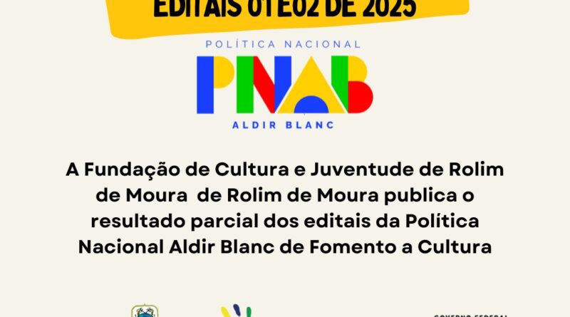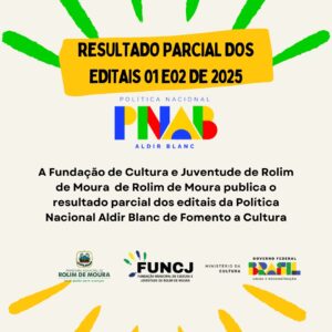 A Fundação de Cultura e Juventude-FUNCJ de Rolim de Moura torna público os resultados parciais dos editais de: Chamamento Público 01 – Fomento Cultural e Edital de Chamamento Público – 02 Premiação a Pontos de Cultura, o presidente da comissão de Elaboração, acompanhamento e prestação de contas, informa para que os proponentes mencionados no respectivo resultado parcial fiquem atentos aos prazos para as demais etapas.