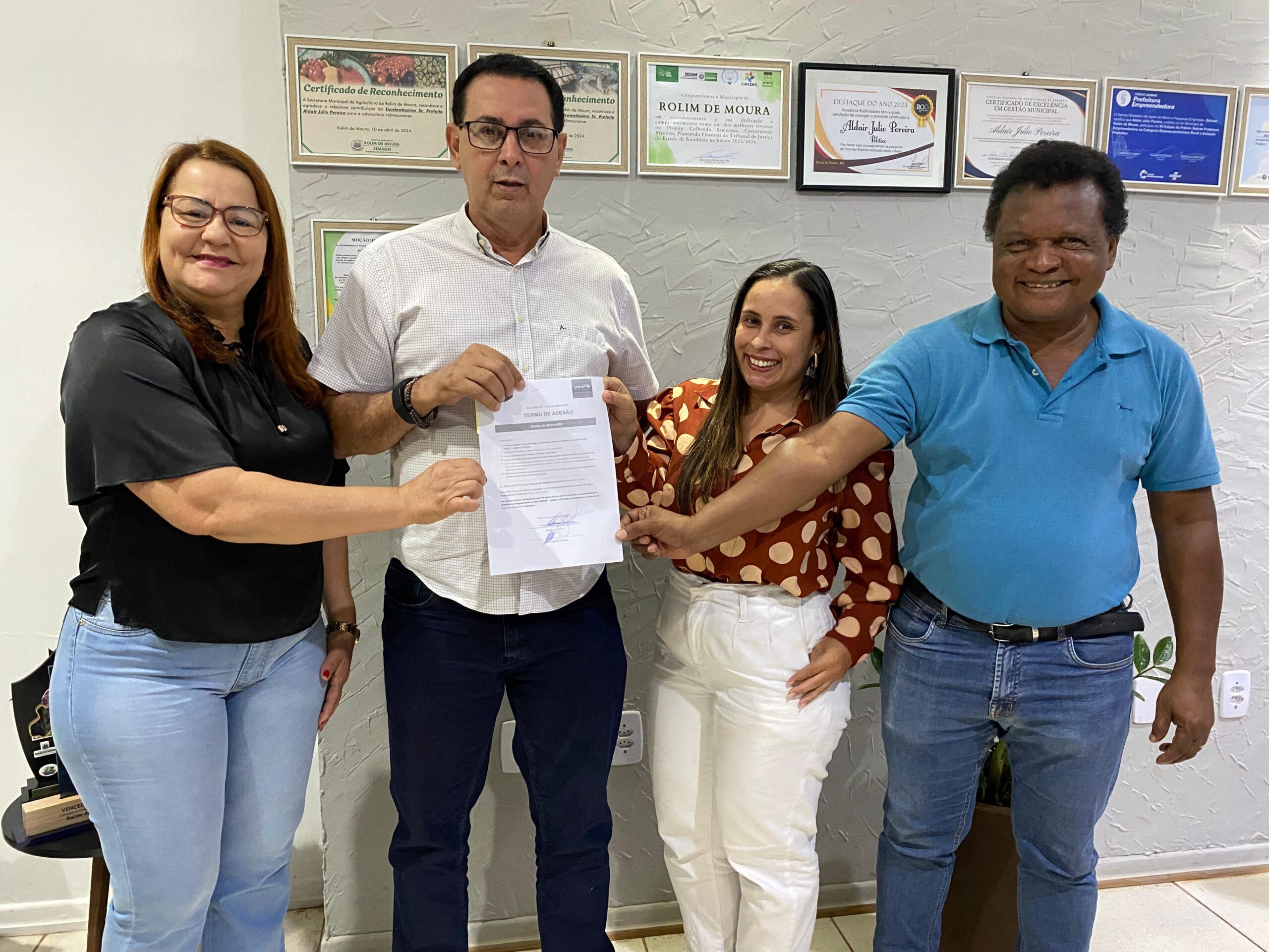 Na manhã desta segunda-feira, (9), o município de Rolim de Moura (RO) reafirmou seu compromisso com a promoção e garantia dos direitos das crianças e adolescentes ao assinar o termo de adesão ao Selo UNICEF – Edição 2025-2028. A assinatura foi realizada no gabinete da Prefeitura, em uma reunião com a presença do prefeito Aldo Júlio, a secretária municipal de Assistência Social Sandra Miranda, o presidente do Conselho Municipal dos Direitos da Criança e do Adolescente (CMDCA), José Carlos de Oliveira (Carlos Cesar), e a articuladora do Selo UNICEF no município, Luana Kaline da Silva.