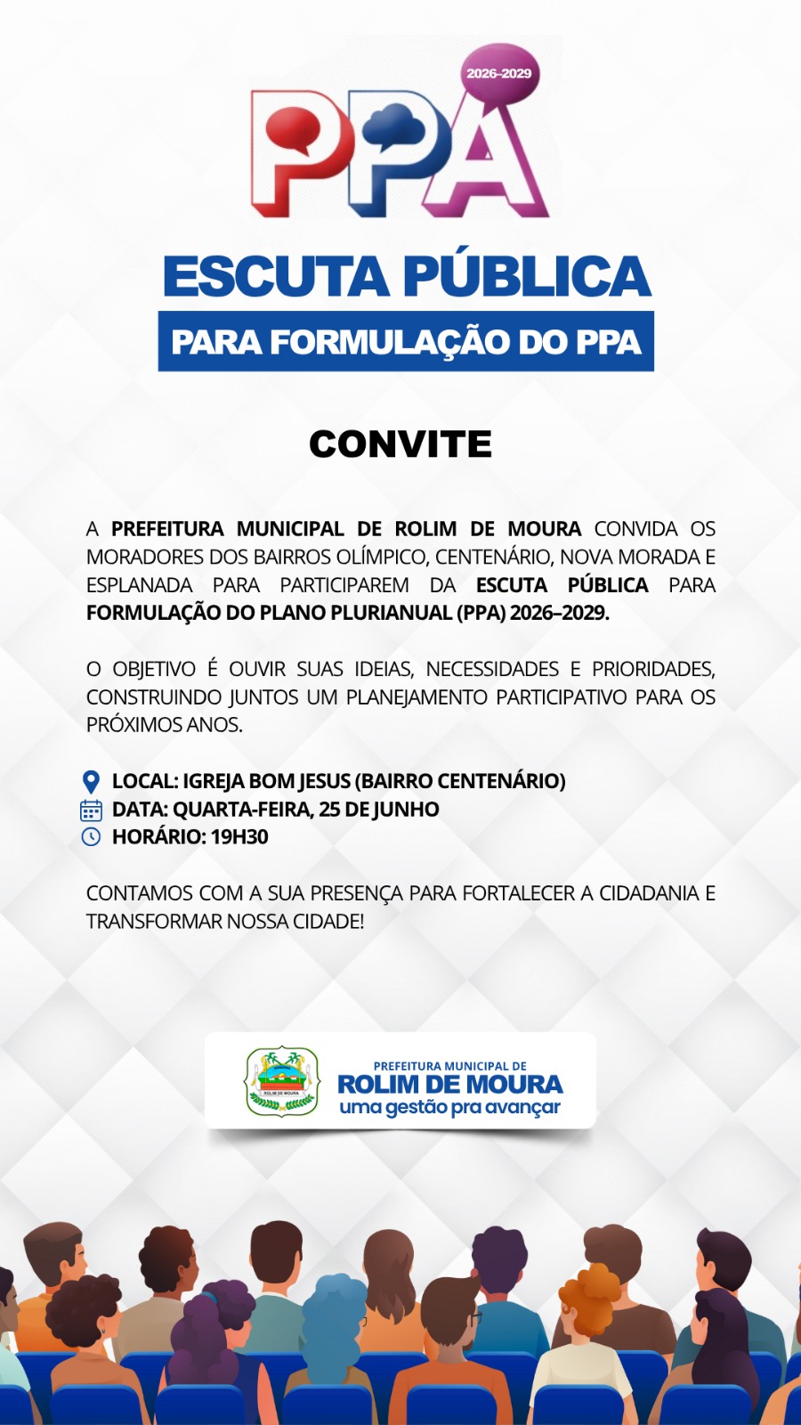 A Prefeitura Municipal de Rolim de Moura convida os moradores para participarem da Audiência Pública do Plano Plurianual (PPA) 2026-2029.