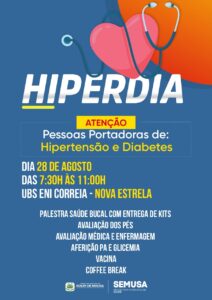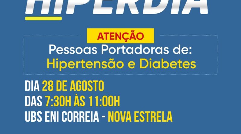 A Prefeitura de Rolim de Moura, por meio da Secretaria Municipal de Saúde (Semusa), realizará no dia 28 de agosto mais uma edição do programa Hiperdia, voltado ao atendimento de pessoas portadoras de hipertensão e diabetes. A ação acontecerá na Unidade Básica de Saúde Eni Correia, no distrito de Nova Estrela, das 7h30 às 11h.