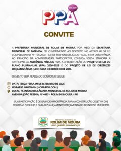 A Prefeitura Municipal de Rolim de Moura, por meio da Secretaria Municipal de Fazenda, em cumprimento ao disposto no artigo 48 da Lei Complementar nº 101/2000 – Lei de Responsabilidade Fiscal, e em observância ao princípio da administração participativa, convida Vossa Senhoria a participar da Audiência Pública para a apresentação do Projeto de Lei do Plano Plurianual (PPA) 2026–2029 e do Projeto de Lei de Diretrizes Orçamentárias (LDO) para o exercício de 2026.