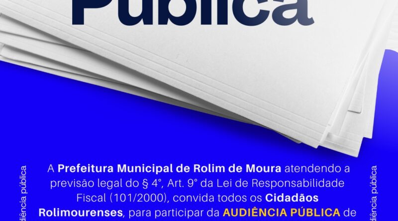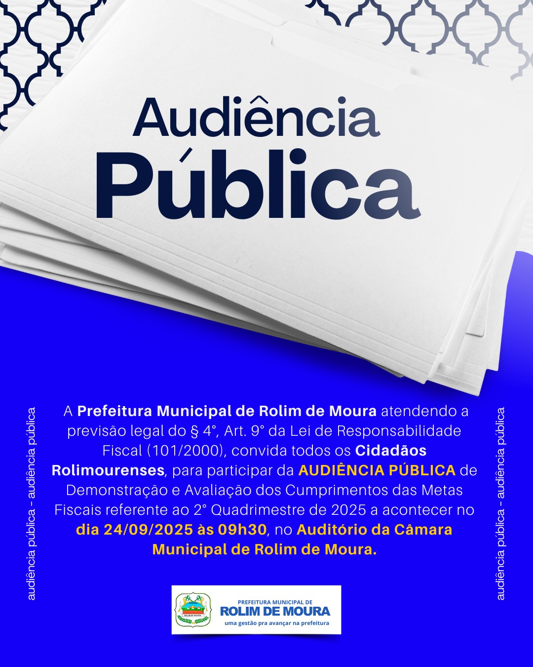 A Prefeitura Municipal de Rolim de Moura atendendo a previsão legal do § 4°, Art. 9° da Lei de Responsabilidade Fiscal (101/2000), convida todos os Cidadãos Rolimourenses, para participar da AUDIÊNCIA PÚBLICA de Demonstração e Avaliação dos Cumprimentos das Metas Fiscais referente ao 2° Quadrimestre de 2025 a acontecer no dia 24/09/2025 às 09:30 hrs, no Auditório da Câmara Municipal de Rolim de Moura.