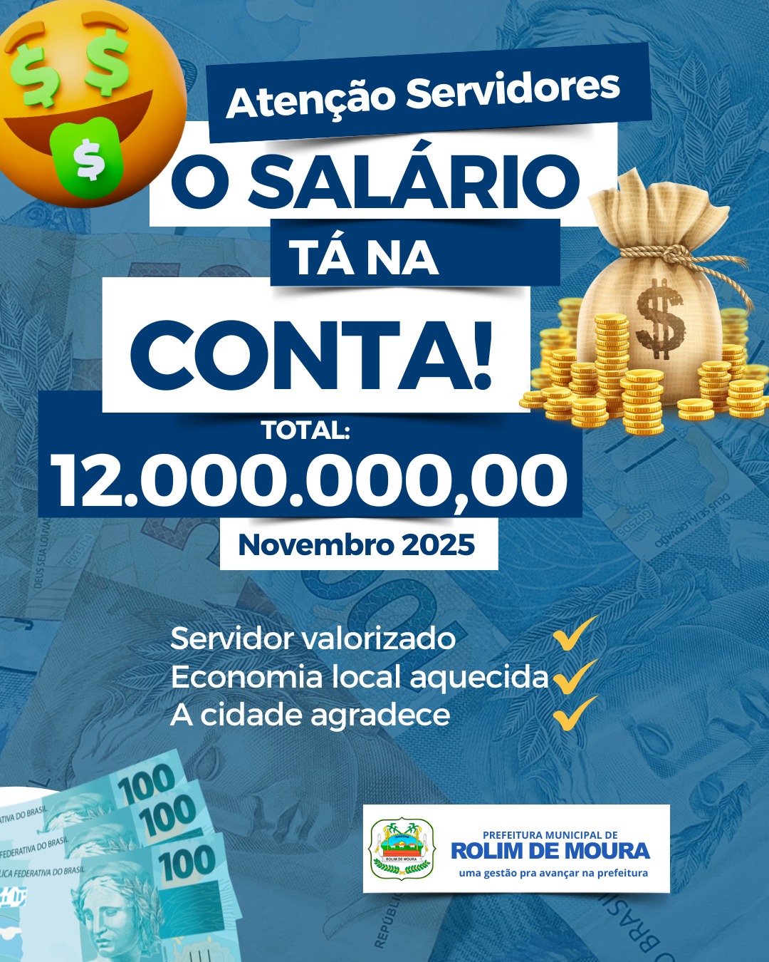 A Prefeitura de Rolim de Moura anunciou o pagamento da folha salarial de novembro dentro do mês trabalhado, garantindo a circulação de R$ 12 milhões na economia do município. O valor, destacado no informe oficial, reforça o compromisso da administração municipal com a valorização dos servidores e o fortalecimento do comércio local.