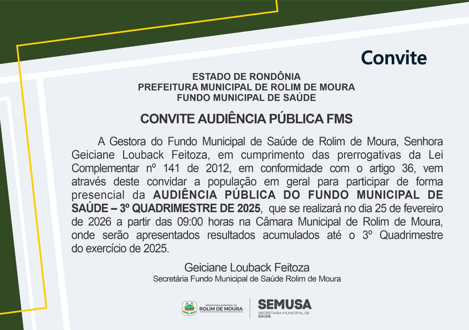 SEMUSA Audiência Pública do Fundo Municipal de Saúde será dia 25 imprensa Rolim de Moura 11 de fevereiro de 2026 0 Comments
