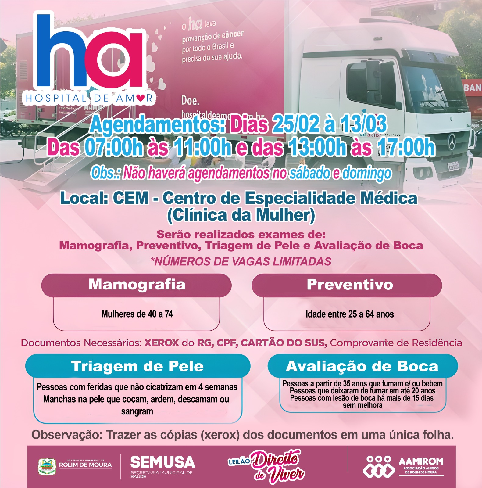 SEMUSA Triagem da carreta do Hospital do Amor começa nesta quarta-feira imprensa Rolim de Moura 24 de fevereiro de 202624 de fevereiro de 2026 0 Comments