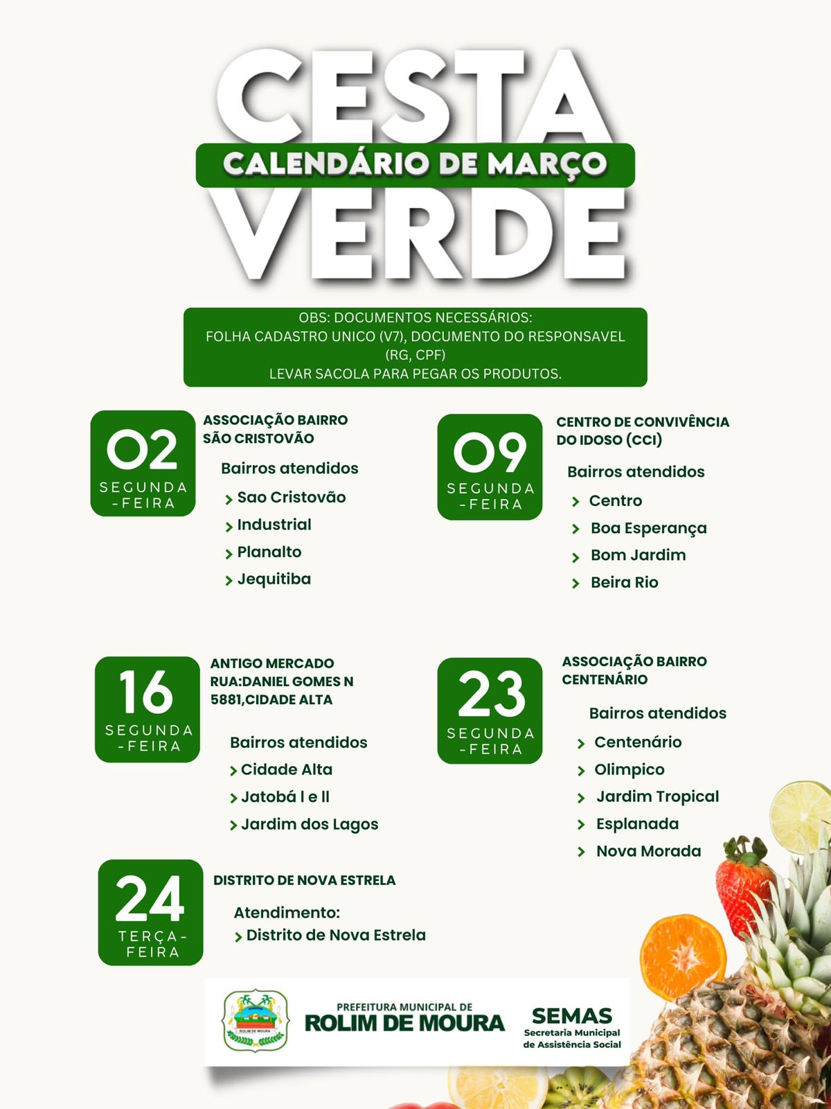 SEMAS Calendário da “Cesta Verde” do mês de março imprensa Rolim de Moura 2 de março de 2026 0 Comments