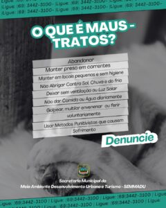 A Secretaria orienta que, ao presenciar qualquer uma dessas situações, a população deve denunciar pelo telefone (69) 3442-3100. A colaboração da comunidade é fundamental para combater os maus-tratos e garantir a proteção e o bem-estar dos animais no município.