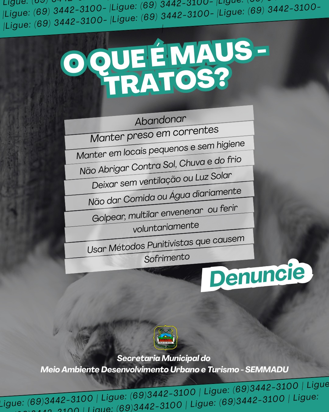 A Secretaria Municipal de Meio Ambiente, Desenvolvimento Urbano e Turismo (SEMMADU) intensificou a campanha de conscientização contra maus-tratos a animais e reforça o pedido para que a população denuncie qualquer situação de violência ou negligência.
