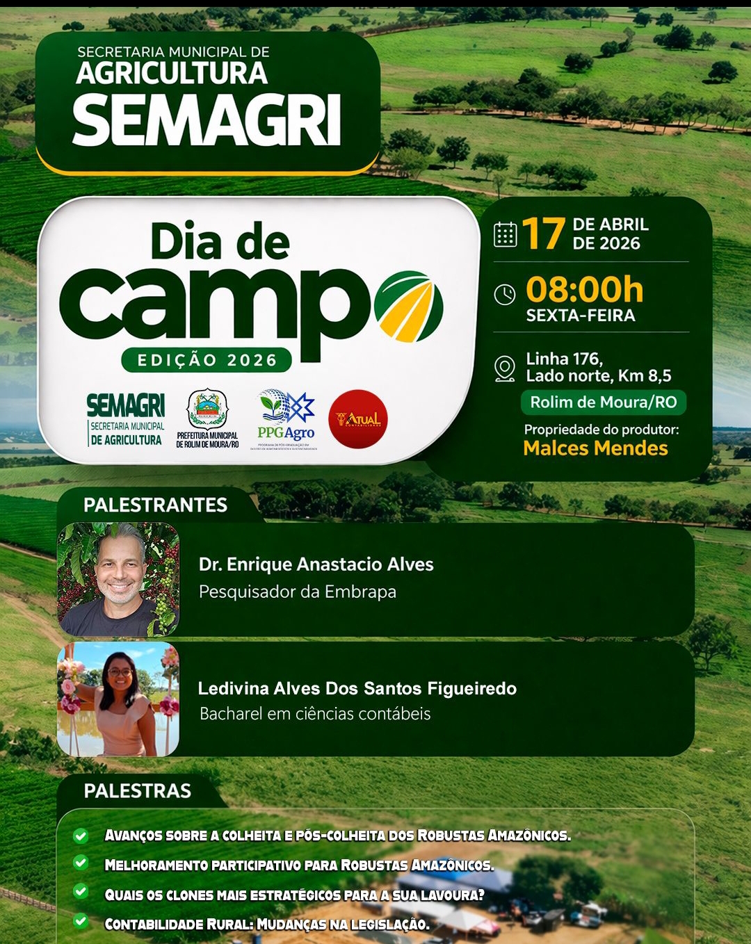 A Secretaria Municipal de Agricultura – SEMAGRI, tem a honra de convidar os produtores rurais para participarem do Dia de Campo.