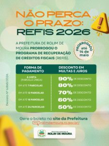 A Prefeitura de Rolim de Moura (RO) reforça o alerta aos contribuintes: o prazo para adesão ao Programa de Recuperação de Créditos Fiscais (Refis 2026) foi prorrogado e segue apenas até o dia 14 de maio. Esta é uma oportunidade para regularizar débitos municipais com condições especiais e descontos expressivos em multas e juros.