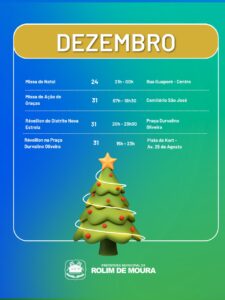 | 14 | 20h | 23h30 | Cerimônia de abertura da Temporada do Natal de Luz | Praça Durvalino Oliveira | 5.000 Pessoas | Prefeitura de Rolim de Moura/Fundação Municipal de Cultura e Juventude |