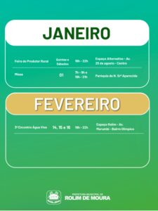 | Quintas e Sábados | 16h | 22h | Feira do Produtor Rural | Espaço Alternativo – Av. 25 de agosto – Centro | 2.000 Pessoas | Assoc. de Feirantes e Produtores Rurais de Rolim de Moura – ASFEPROM |