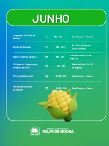 | 05 | 19h | 2h | IX Arraial da Farol | Praça Durvalino Oliveira | 1.000 Pessoas | Faculdade de Rolim de Moura – FAROL |