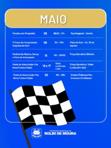 | 10 | 15h | 23 | 5ª Etapa do Campeonato Regional de Kart | Pista de Kart – Av. 25 de agosto – Centro | NI | Associação dos Kartistas de Rolim de Moura – RM KART |