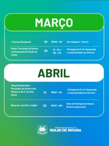 | 27 | 18h30 | 21h | Feira Gastronômica da União Feminina das Assembleias de Deus de Rolim de Moura – UFADERM | Rua Guaporé – Centro | 500 Pessoas | Igreja Evangélica Assembleia de Deus Templo-Sede |