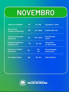 | 02 | 7h | 18h30 | Dia de Finados (Visitação e celebração no Cemitério São José) | Cemitério São José – Rua Barão de Melgaço – Bairro Planalto | 20.000 Pessoas | Prefeitura de Rolim de Moura/Secretaria Municipal de Obras e Serviços Públicos |