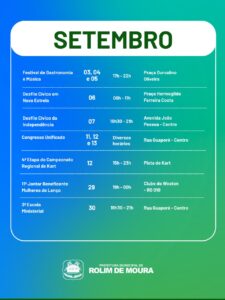 | 18 | 15h | 23h | 3ª Etapa do Campeonato Regional de Kart | Pista de Kart – Av. 25 de agosto – Centro | NI | Associação dos Kartistas de Rolim de Moura – RM KART |