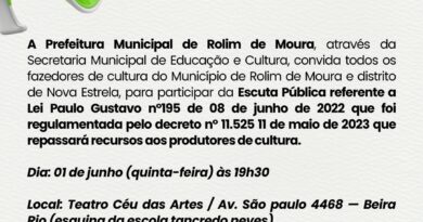 A PREFEITURA DE ROLIM DE MOURA ATRAVÉS DO DEPARTAMENTO DE CULTURA E DO CONSELHO MUNICIPAL DE POLÍTICA CULTURAL, CONVIDA TODA CLASSE ARTÍSTICA E CULTURAL, DE ROLIM DE MOURA E DO DISTRITO DE NOVA ESTRELA, PARA PARTICIPAREM DA 2° ESCUTA PÚBLICA, REFERENTE OS INVESTIMENTOS DA LEI ALDIR BLANC – PNAB, QUE FINANCIARÁ PROJETOS CULTURAIS.
